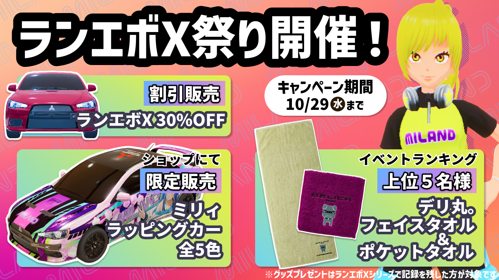 ①通常はMILANDガチャでしか入手できないスーパーレアアイテム「ミリィラッピングカー」が、期間限定でショップに登場!「ランエボX」もお得に!